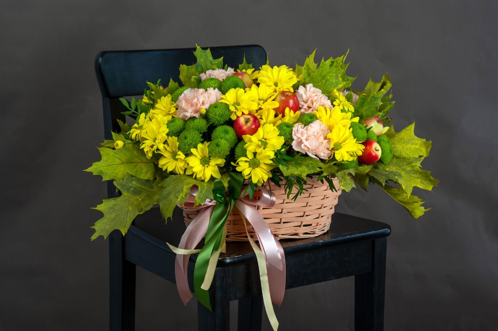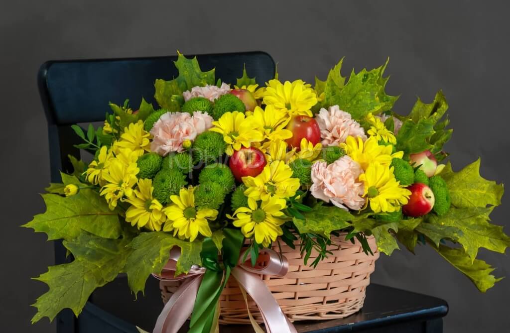Хризантема кустовая 9 шт., диантус 5 шт., фисташка, яблоки, дуб, оазис, корзина, декор.