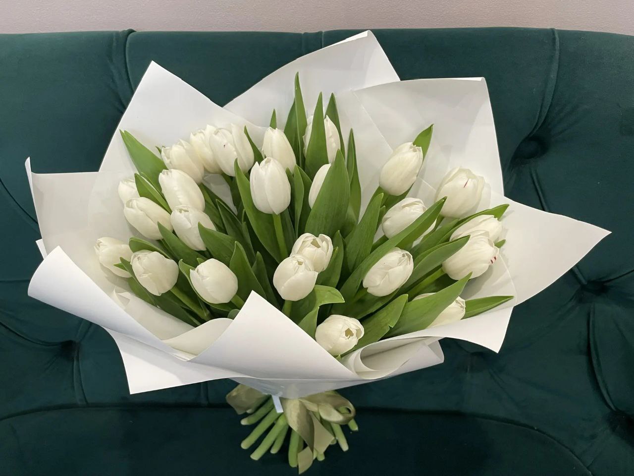 Тюльпан белый 25 шт., упаковка, атласная лента.