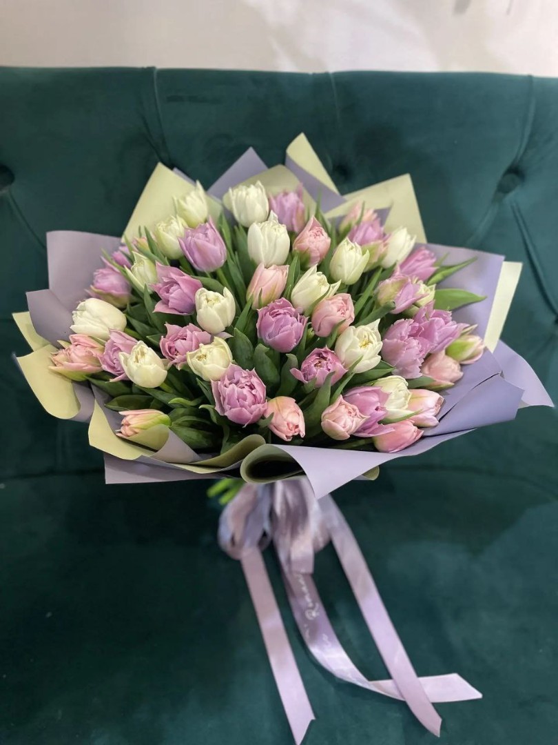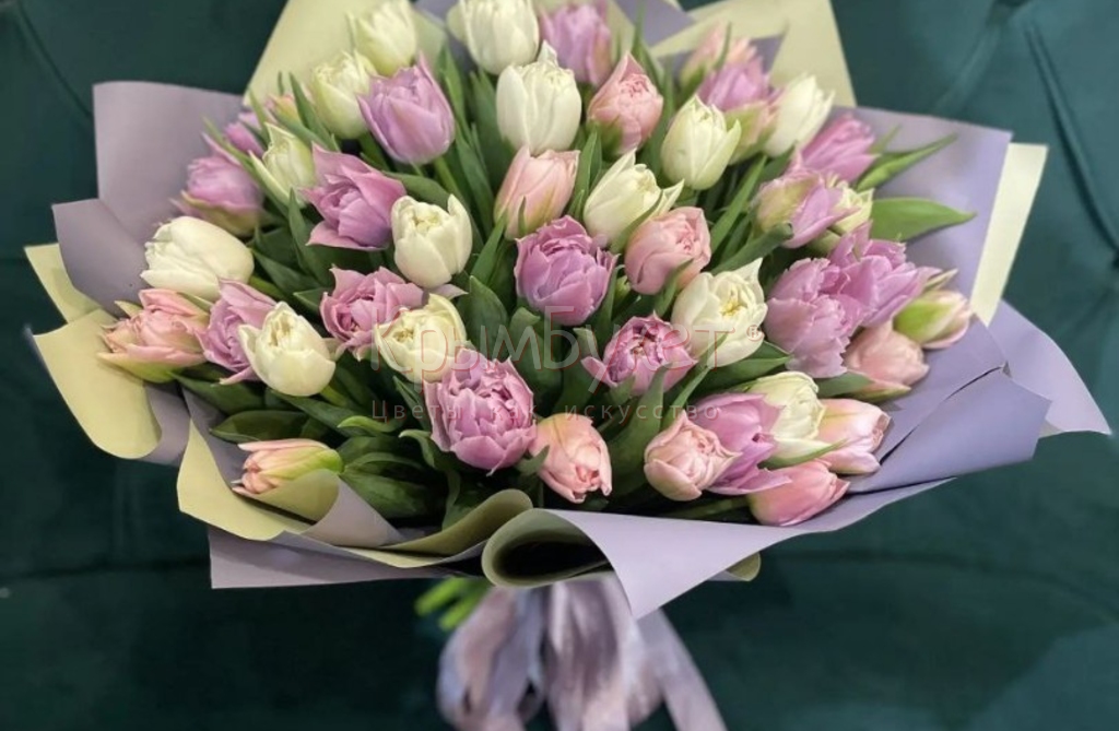 Букет из разноцветных пионовидных тюльпанов в пастельных оттенках (51 шт.)